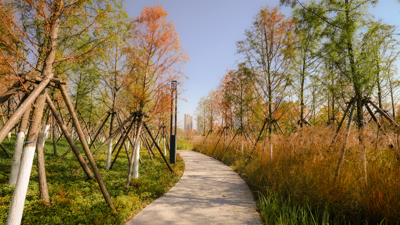 设计采用 “乔木 + 灌木 + 原生地被” 的混植模式,没有规整的绿化色块,而是让秋色叶树(橙红、金黄叶)、常绿树与草本植物自然交织,既模拟原生生态的野性层次,又通过季相植物的搭配,让画面随季节呈现丰富的色彩变化,避免了人工绿化的刻板感。