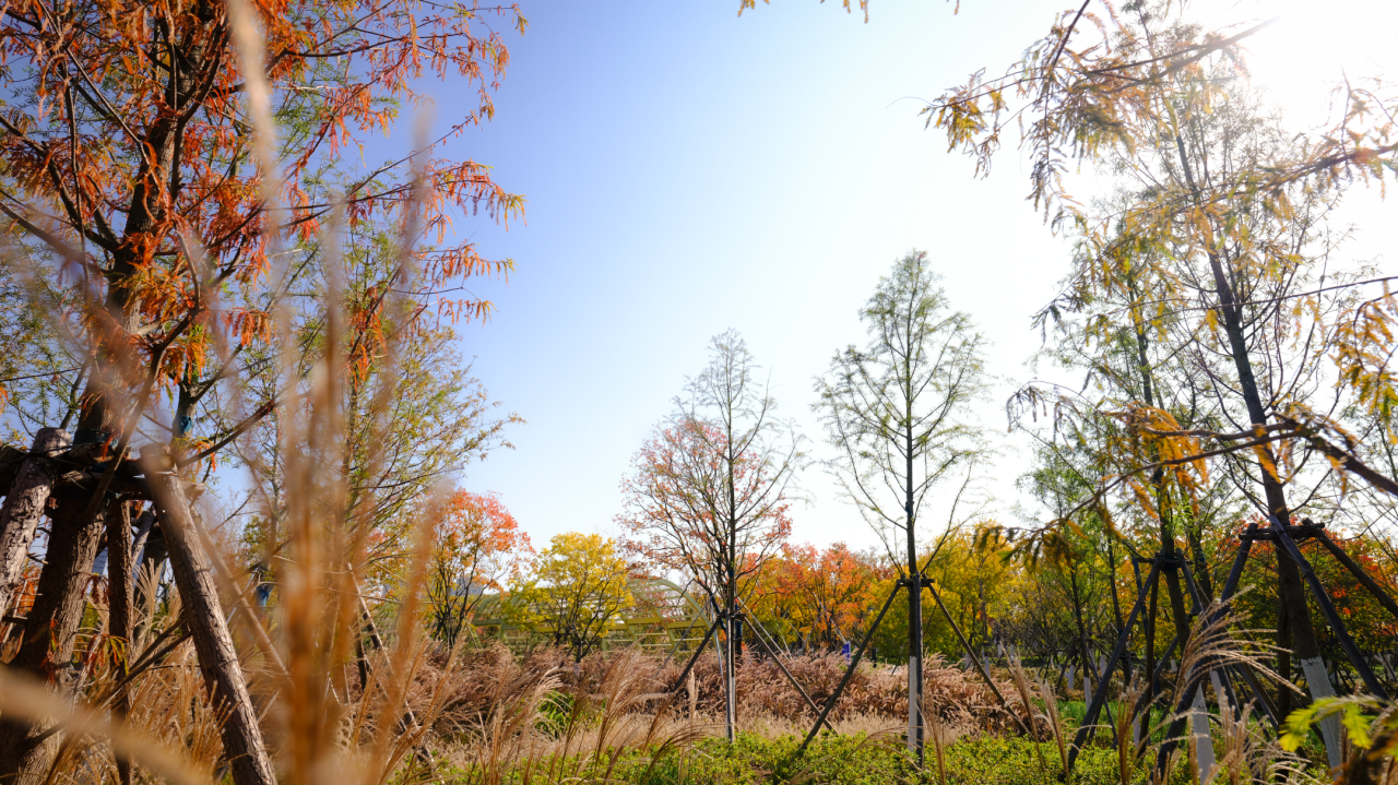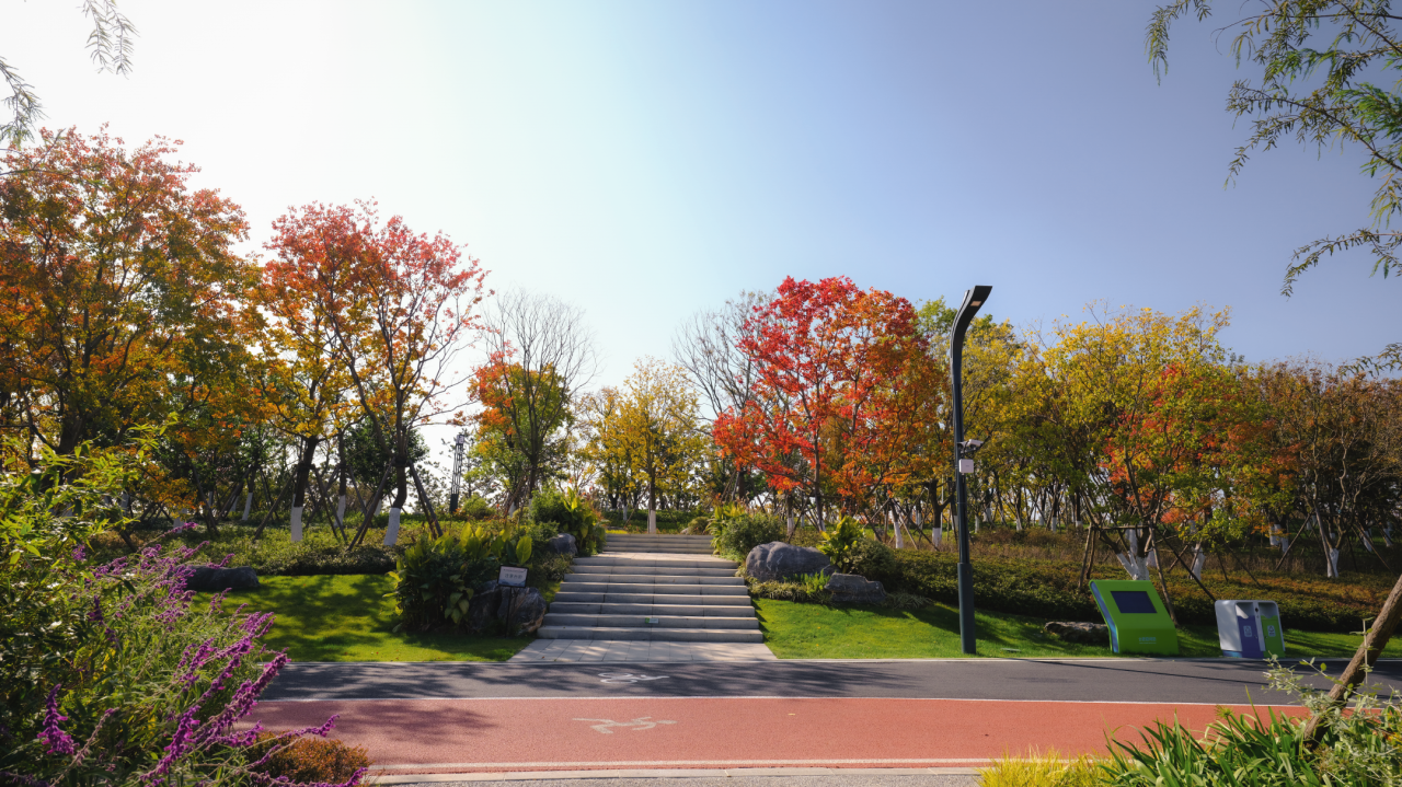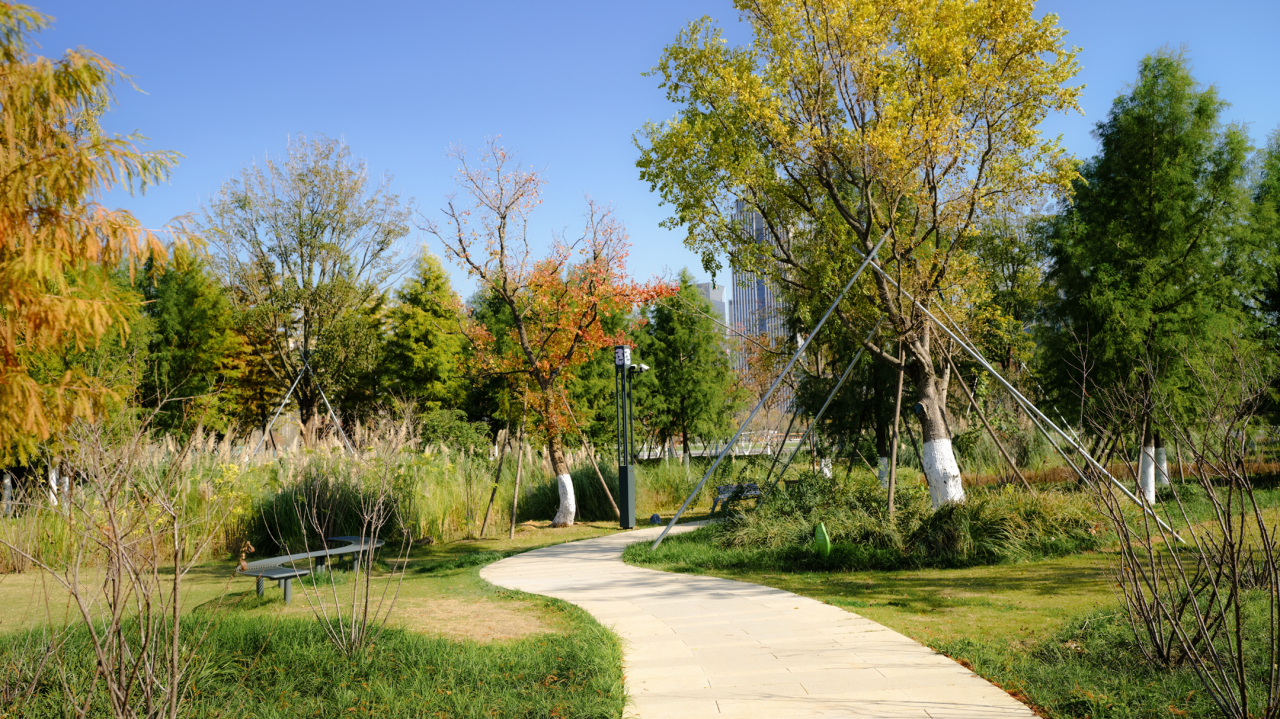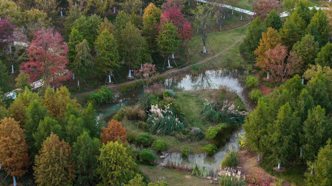 The design adopts a mixed planting model of "deciduous trees + shrubs + native ground cover," avoiding rigid green blocks. Instead, it allows autumn-colored trees (with orange-red and golden leaves), evergreen trees, and herbaceous plants to naturally intertwine. This approach not only mimics the wild layers of native ecosystems but also creates dynamic seasonal color shifts through the combination of seasonal plants, eliminating the monotony of artificial landscaping.