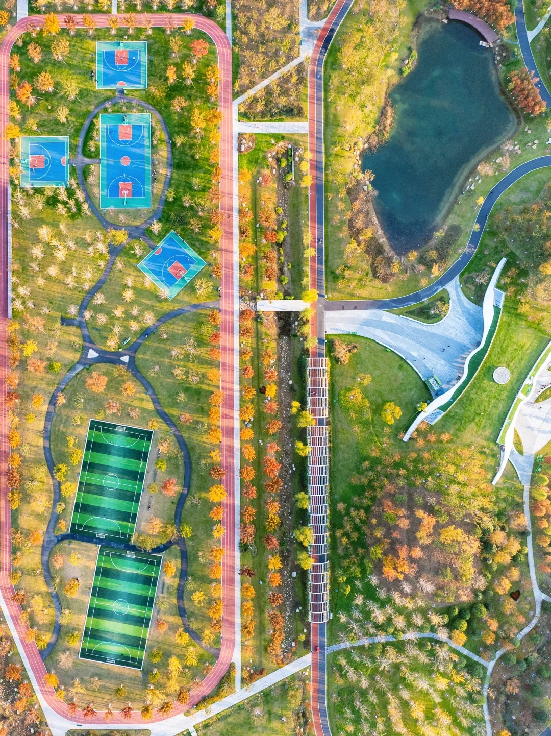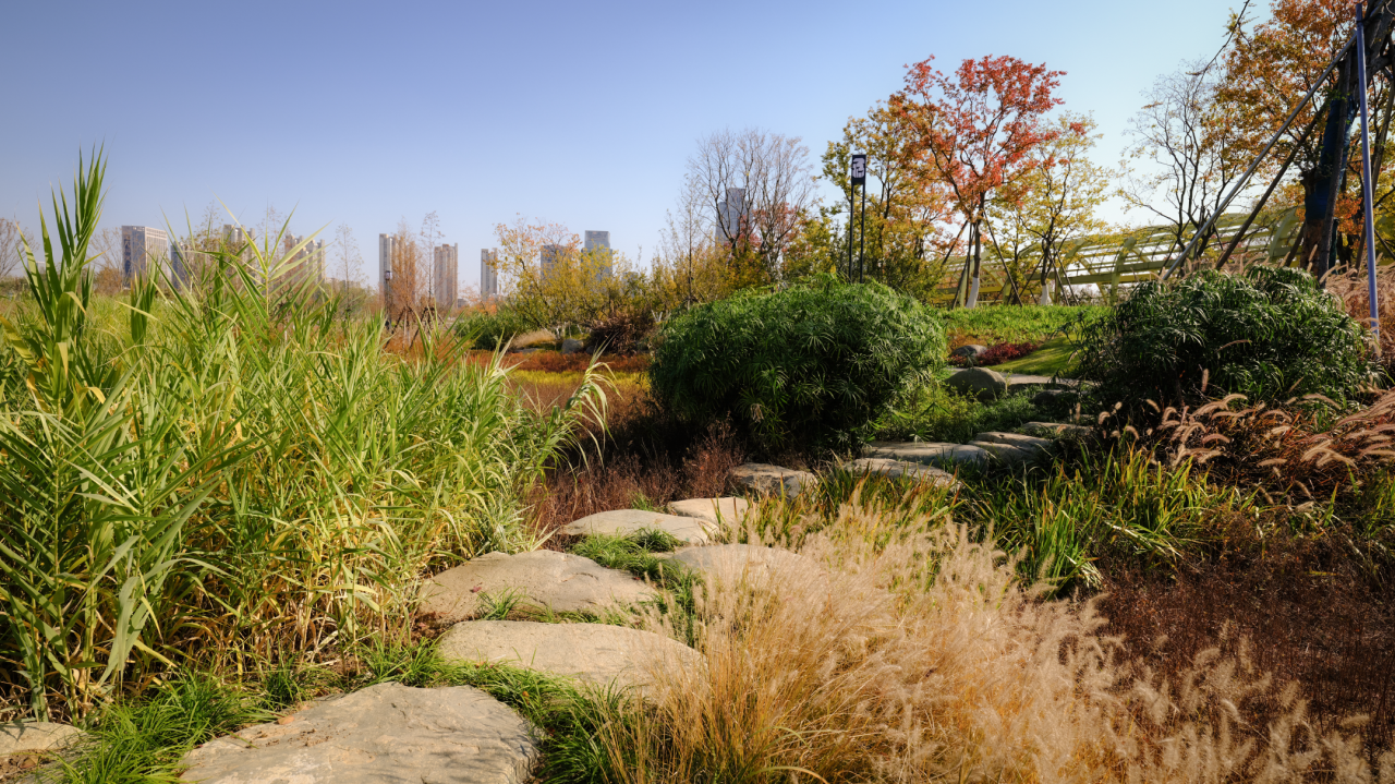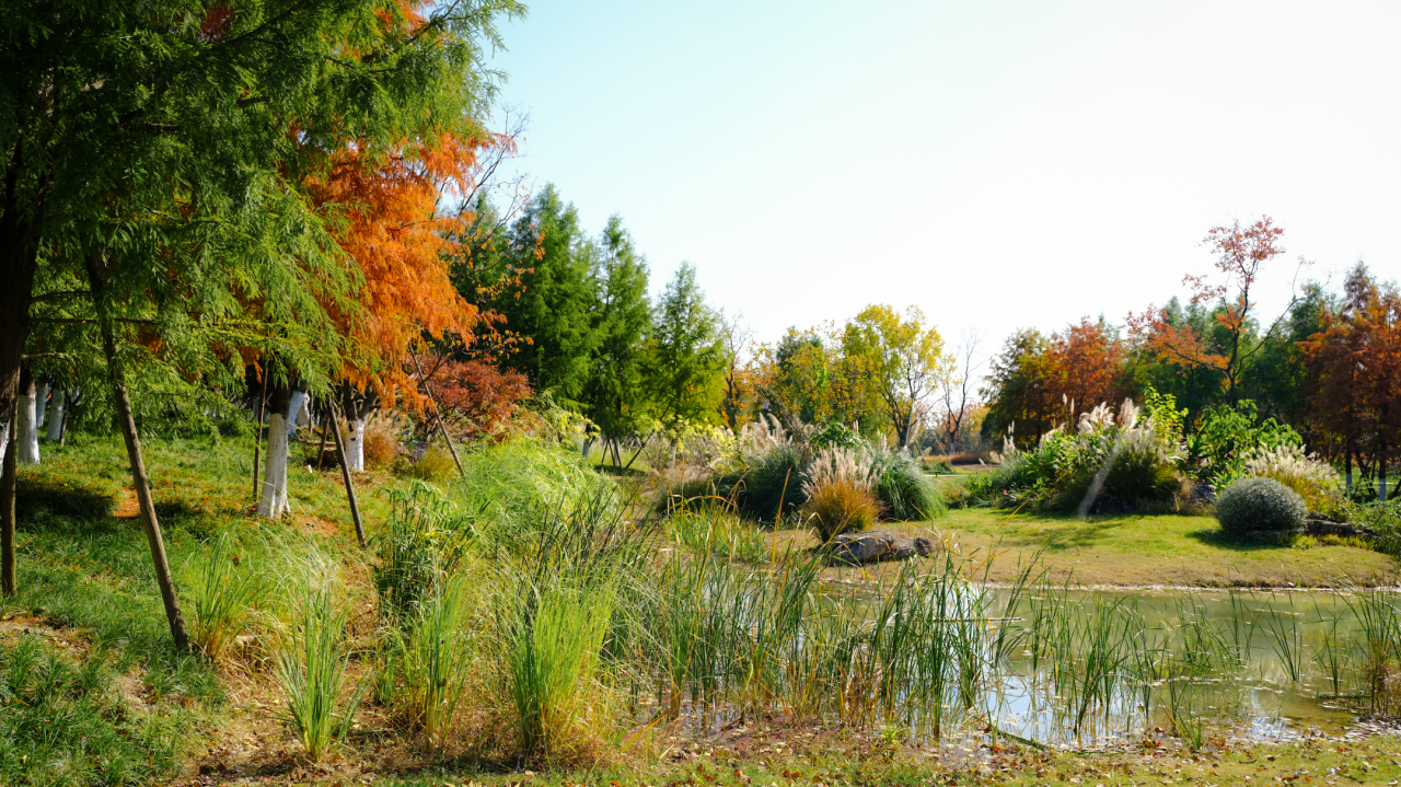 The design adopts a mixed planting model of "deciduous trees + shrubs + native ground cover," avoiding rigid green blocks. Instead, it allows autumn-colored trees (with orange-red and golden leaves), evergreen trees, and herbaceous plants to naturally intertwine. This approach not only mimics the wild layers of native ecosystems but also creates dynamic seasonal color shifts through the combination of seasonal plants, eliminating the monotony of artificial landscaping.